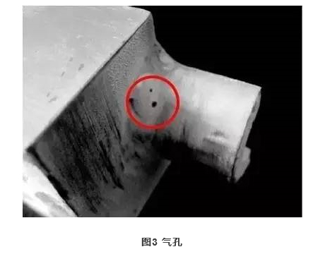 砂眼是鑄造閥門的表面常見的缺陷,主要出現在閥門外表面,砂眼內部有砂或白色的渣,外形不規整,深淺不一。氣孔一般出現在鑄造閥門的內部、表面或近于表面處,表面比較光滑,呈圓形或橢圓形,有時孤立存在,有時簇集在一起,常與夾渣或縮松并存(圖3所示)。如果是反應性氣孔,通常不大,在鑄件表面或鑄件表面以下不太深的地方,如果是侵入性氣孔,面積稍大,常呈圓形、橢圓形或針孔狀。
