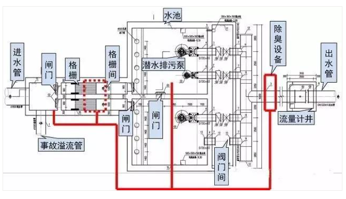 進水口——格柵間——水池——閥門間——流量計井——市政干管