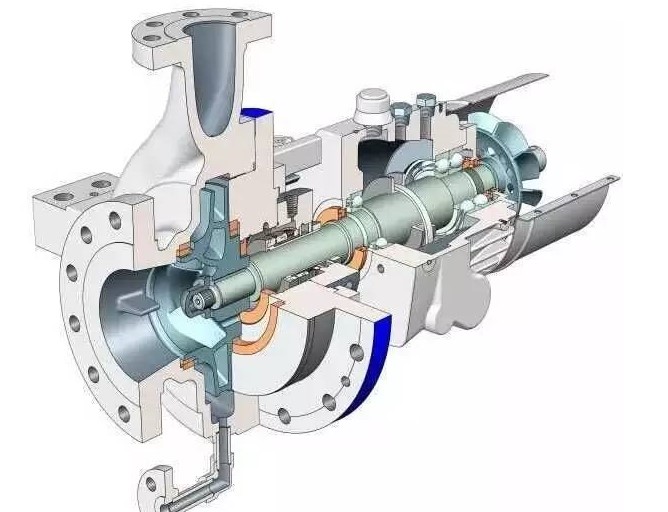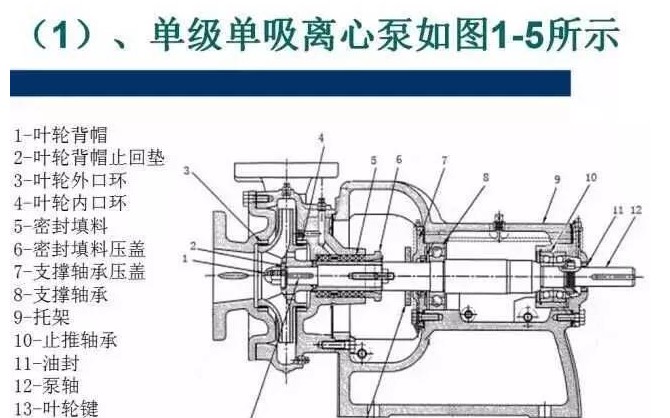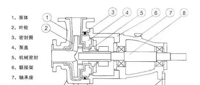 離心泵的基本構造是由八部分組成的,分別是:葉輪,泵體,泵蓋,擋水圈,泵軸,軸承,密封環,填料函,軸向力平衡裝置。