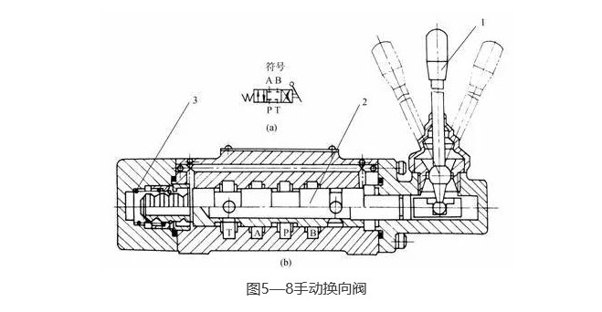 圖5-8(b)為自動(dòng)復(fù)位式手動(dòng)換向閥,放開(kāi)手柄1、閥芯2在彈簧3的作用下自動(dòng)回復(fù)中位,該閥適用于動(dòng)作頻繁、工作持續(xù)時(shí)間短的場(chǎng)合,操作比較完全,常用于工程機(jī)械的液壓傳動(dòng)系統(tǒng)中。