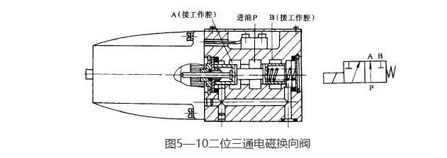 圖5—10為二位三通板式交流電磁換向閥的結(jié)構(gòu)和圖形符號(hào)圖。當(dāng)電磁鐵通電時(shí),即推動(dòng)推桿將閥芯頂向右端;又當(dāng)電磁鐵斷電時(shí),閥芯在彈簧的作用下回到左端,從而實(shí)現(xiàn)了油路的換向。