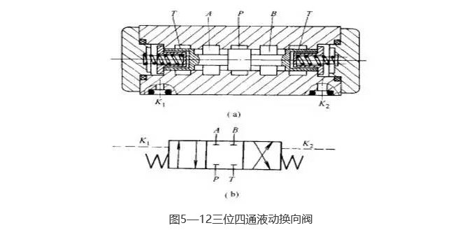 圖5-12所示為液動(dòng)換向閥的結(jié)構(gòu)圖和圖形符號(hào)圖。當(dāng)控制油口K1、K2均無(wú)控制壓力油通入時(shí),閥芯在兩端彈簧作用下處于中位(圖示位置);當(dāng)K1通入控制壓力油、K2通回油時(shí),閥芯在液壓力作用下克服右端彈簧力移向右端;反之,當(dāng)K2通控制壓力油、K1通回油時(shí),閥芯被推向左端,從而實(shí)現(xiàn)了油路的換向。