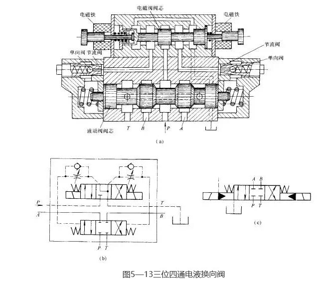 圖5-11所示為35D-25B型三位五通板式交流電磁換向閥的結(jié)構(gòu)和圖形符號(hào)圖。當(dāng)左、右電磁鐵均斷電時(shí),其閥芯在兩端彈簧的作用下處于中位(圖示位置);當(dāng)左電磁鐵通電時(shí),即推動(dòng)推桿將閥芯頂向右端;當(dāng)右電磁鐵通電時(shí),即推動(dòng)推桿將閥芯頂向左端,從而實(shí)現(xiàn)了油路的換向。