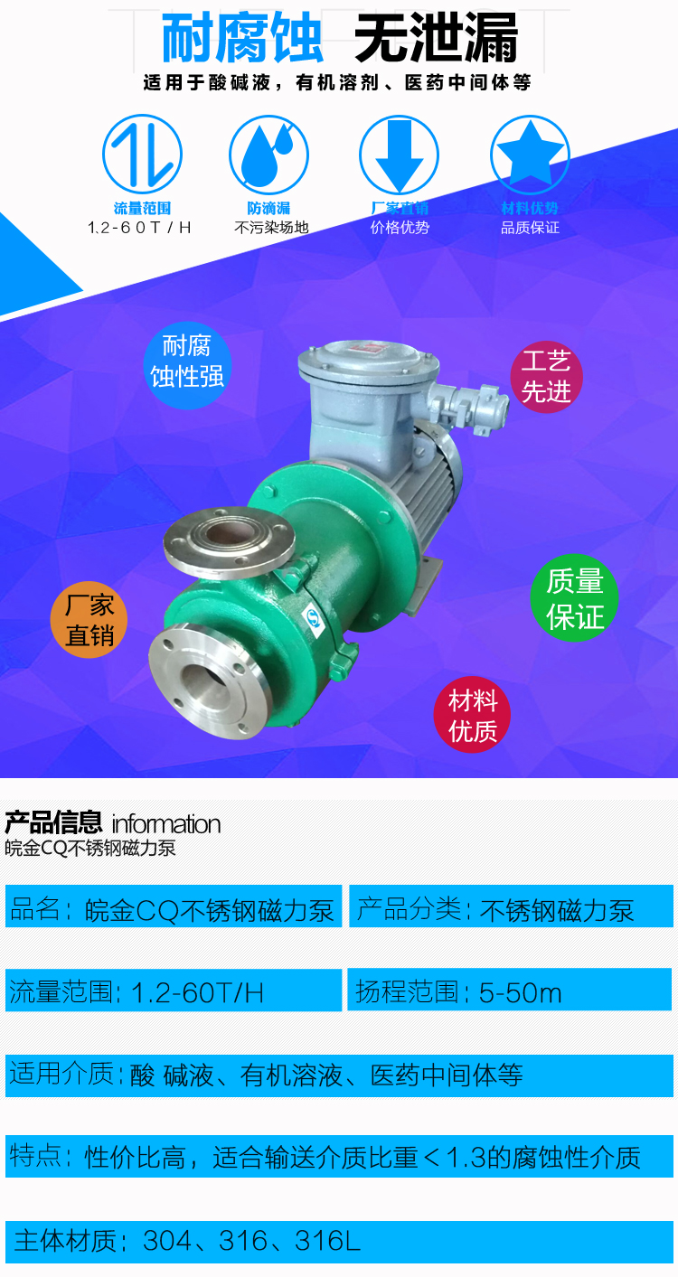 JCQ不銹鋼磁力泵是很早應(yīng)用的無泄漏不銹鋼泵,過流部件采用不銹鋼制成,是公司原CQ型升級(jí)產(chǎn)品,應(yīng)用于石油、化工、制藥、電鍍、環(huán)保、污水處理、酸洗等行業(yè)在金屬泵市場上該產(chǎn)品具有價(jià)格優(yōu)勢。產(chǎn)品結(jié)構(gòu)簡單,體積小,噪音低。